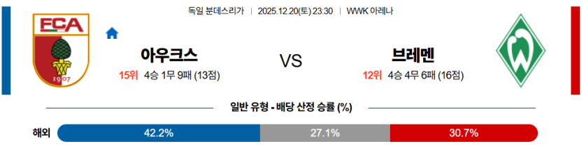 브레멘은 점유율을 높이려다 턴오버가 발생하면, 아우크스부르크의 **빠른 전환**을 감당하지 못하고 무너질 가능성이 큽니다.