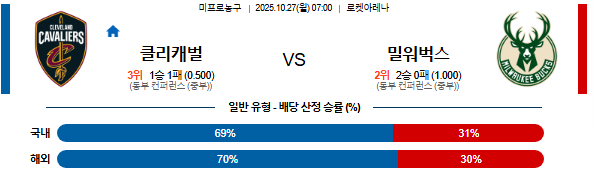 25년 10월 27일 NBA 분석 클리블랜드캐벌리어스 vs 밀워키벅스 [스포팡]