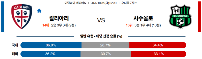 25년 10월 31일 세리에 A 분석 칼리아리 칼초 vs 사수올로 [스포팡]