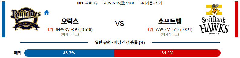 2025년 9월 15일 14시, 일본 프로야구(NPB)에서 오릭스 버팔로스와 소프트뱅크 호크스가 맞붙는다.