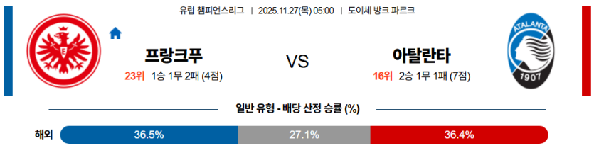 25년 11월 27일 05:00 UEFA 챔피언스리그 분석 프랑크푸르트 vs 아탈란타 BC [스포팡]