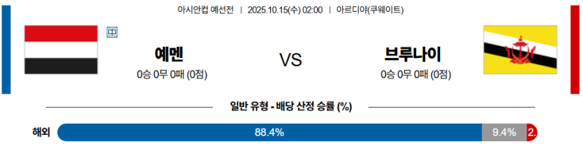 📝 스포팡 경기 프리뷰2025년 10월 15일 AFC 아시안컵 예선전,예멘과 브루나이의 맞대결이 펼쳐진다.예멘은 4-3-3 포메이션 기반의 높은 타점과 세컨드볼 재가공에 강점을 보이며, 브루나이는 4-4-2 두 줄 수비를 유지하지만 센터백 신장의 약점을 안고 있다.1차전 2-0 승리 이후 자신감이 높아진 예멘이 공중전과 세컨드볼 우위를 바탕으로 경기를 주도할 전망이다.🔎 스포팡 전술 분석 및 주요 포인트✅ 예멘 (YEMEN) 포메이션: 4-3-3, 폭과 깊이를 모두 활용하는 공격 전개 핵심 선수: 알 마타리(포스트 플레이/니어포스트 침투), 알가와시(정확한 크로스) 강점: 공중전 제공권과 세컨드볼 재가공 루틴 완성 공격 특징: 풀백 오버래핑 + 윙 인버트 움직임으로 크로스 볼륨 확보 세트피스..