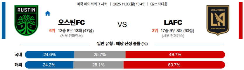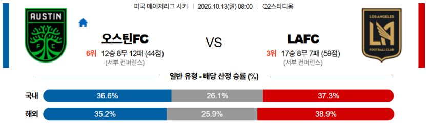 📝 스포팡 경기 프리뷰2025년 11월 03일 메이저리그사커,오스틴 FC와 LA FC의 맞대결이 펼쳐진다.오스틴은 후방 빌드업 시 수비수 간 간격 조절 불안정으로 **압박 저항력**이 부족하며 공격 템포가 무너지는 약점을 보인다.LAFC는 손흥민의 폭발적인 가속과 **틸만의 전진 패스**를 중심으로 하프라인 위에서부터 공격을 지배하는 완성된 구조를 갖췄다.이 경기는 **'압박 효율과 빌드업 안정성'**의 충돌이며, 전술 완성도와 공격 결정력에서 압도적인 LAFC가 승리를 가져갈 가능성이 높다.🔎 스포팡 전술 분석 및 주요 포인트✅ 오스틴 FC (Austin FC)포메이션: 4-3-3 형태, 빌드업 불안정.주요 선수: 우주니 (중원 방향 전환), 부카리 (측면 드리블), 페레이라 (전방 연계).빌드업 ..