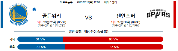 📝 스포팡 경기 프리뷰2월 12일 낮 12시, 체이스 센터에서 골든스테이트 워리어스와 샌안토니오 스퍼스의 NBA 경기가 펼쳐집니다. 이번 경기는 전력 차이가 명확합니다. 홈팀 골든스테이트는 주축 선수들의 공백으로 인해 팻 스펜서, 퀸튼 포스트 등 경험이 적거나 기량이 떨어지는 선수들이 라인업을 채우고 있습니다. 반면 원정팀 샌안토니오는 '괴물' 빅터 웸반야마를 중심으로 데빈 바셀, 줄리안 챔패그니 등 주력 자원들이 건재합니다. 홈팀 골든스테이트가 +6.5점이라는 핸디캡을 받았다는 것은 그만큼 전력 열세가 예상된다는 방증입니다. 웸반야마의 높이와 샌안토니오의 조직력이 골든스테이트의 헐거운 라인업을 무너뜨릴 것으로 보입니다.🔎 스포팡 전술 분석■ 골든스테이트 워리어스 (Home)핵심 포인트: '버티기 힘..
