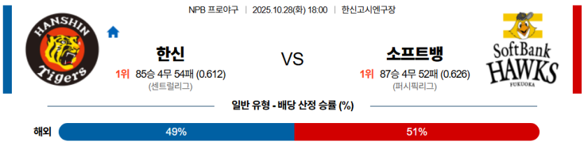 📝 스포팡 경기 프리뷰2025년 10월 30일 일본프로야구(NPB) 시리즈 4차전,한신 타이거즈와 소프트뱅크 호크스의 맞대결이다.한신은 코시엔 전문 투수 오타케를 내세워 연패 저지를 노리지만, 좌완 투수에 대한 소프트뱅크 타선의 공략이 변수다.소프트뱅크는 4일 휴식 후 등판하는 아리하라를 기용하며 시리즈 종결을 노린다.한신의 심각한 타격 문제와 소프트뱅크의 상성 우위를 고려할 때, 소프트뱅크가 신승을 가져갈 것이다.🔎 스포팡 선발 및 전력 분석✅ 한신 타이거즈 (Hanshin Tigers)선발: 오타케 코타로 (코시엔 전문 투수, 교류전 소프트뱅크전 5이닝 무실점 승리 경험).투수 약점: 직전 경기에서 소프트뱅크 타선이 좌완 투수들을 공략했다는 점이 오타케에게는 부담.타선 약점: 원정보다 홈에서의 타..