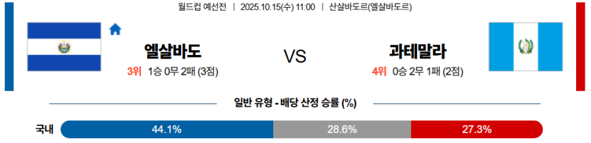 📝 스포팡 경기 프리뷰2025년 10월 15일 FIFA 월드컵 예선전,엘살바도르와 과테말라의 맞대결이 펼쳐진다.엘살바도르는 4-1-4-1 전형 기반의 빠른 전환과 라인브레이킹 침투가 강점이며, 과테말라는 4-3-3 전형을 사용하지만 과도하게 높은 수비 라인과 느린 발의 수비진이 약점이다.엘살바도르가 속도전과 공간 활용 능력에서 압도적 우위를 점할 전망이다.🔎 스포팡 전술 분석 및 주요 포인트✅ 엘살바도르 (EL SALVADOR) 포메이션: 4-1-4-1, 빠른 전환 및 직선적 침투 핵심 선수: 마우리시우(라인브레이커/폭발적 가속), 엔리케즈(플레이메이커/짧은 연계), 오르티즈(공수 템포 조율/전환) 강점: 빠른 압박 회수를 통한 전환 속도 극대화, 2선의 침투 빈도 높음✅ 과테말라 (GUATEM..