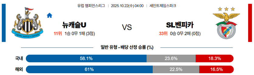 📝 스포팡 경기 프리뷰2025년 10월 22일 04:00, UEFA 챔피언스리그,뉴캐슬 유나이티드와 SL 벤피카의 맞대결이 펼쳐진다.이 경기는 뉴캐슬의 강력한 홈 압박과 빠른 전환 템포가 벤피카의 원정 심리적 불안정과 수비 조직력 불안을 압도할 것입니다.뉴캐슬은 토날리의 정교한 템포 조율과 엘랑가의 하프스페이스 침투를 활용해 **경기 주도권**을 완전히 장악할 것입니다.전술 완성도와 홈 이점, 체력 우위까지 갖춘 **뉴캐슬의 승리**가 가장 유력한 시나리오입니다.✅ 뉴캐슬 유나이티드 (Newcastle United)포메이션: 4-3-3. 강한 압박과 빠른 전환 템포를 무기로 한다.공격 특징: 엘랑가의 폭발적 침투와 반스의 탁월한 위치선정. 토날리가 전진 패스 타이밍을 완벽하게 조율한다.강점: 전방 압박..